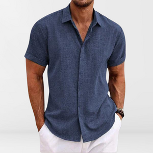 This men's short-sleeved shirt is perfect for summer occasions. The button placket emphasizes its classic style. An uncomplicated top for leisure, travel, or everyday wear.