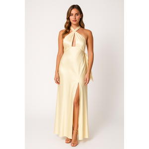 This sleeveless maxi-length wedding guest dress impresses with its tailored silhouette and a sophisticated front slit. The halter neckline adds a feminine touch and ensures a flattering look. Ideal for festive evenings and weddings.