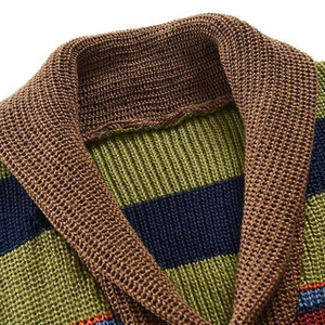This men's cardigan makes a bold statement with its geometric stripes. The button placket makes it versatile and suitable for everyday wear. Perfect for casual outfits from the office to the weekend.