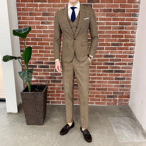 This men's suit impresses with its three-piece set consisting of a jacket, waistcoat, and trousers. Whether for a wedding, business meeting, or celebration, the suit offers a timeless style suitable for many occasions.