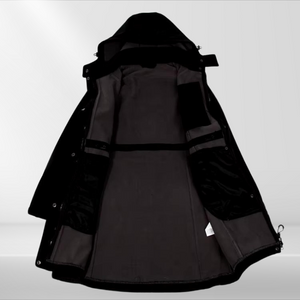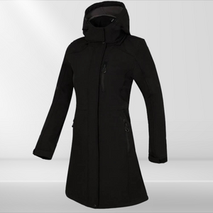 This long women's jacket combines clean lines with a functional design. An adjustable waist and hood ensure a customized fit, while large pockets offer extra storage space. An ideal style for outdoor activities.