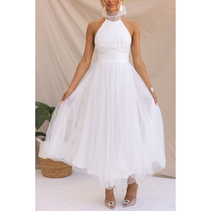 This halter-neck dress brings a clean, festive air to any celebration. The silhouette is light and flowing, ideal for weddings and special moments. A striking look that's effortlessly styling.