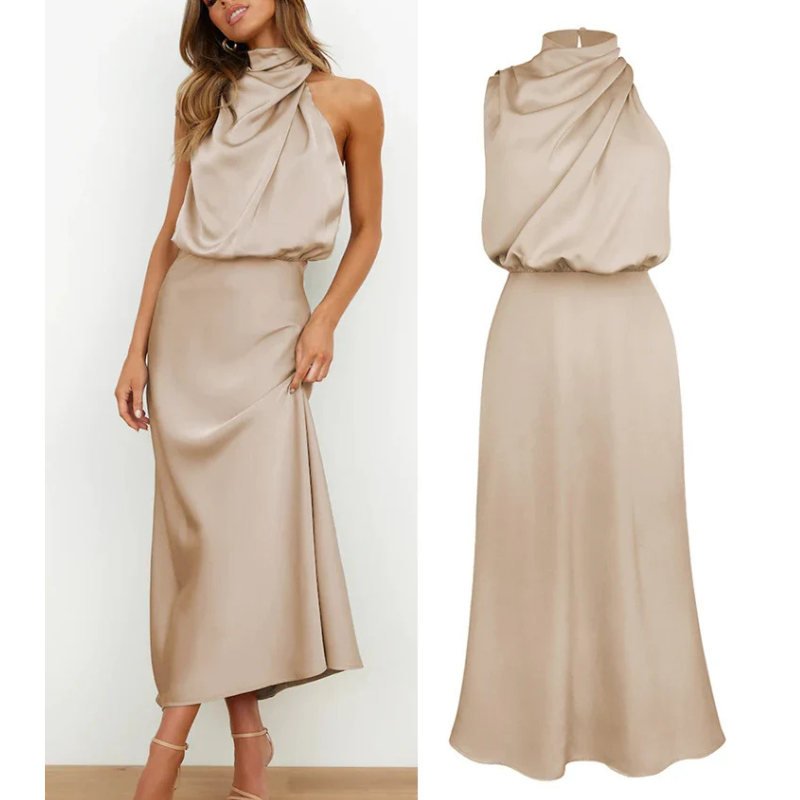 Dieses Maxi Kleid bringt eine klare, festliche Präsenz zu besonderen Momenten. Der fließende Fall umspielt die Figur mit ruhiger Linie. Passt zu Feiern, Galadinnern und Trauungen.