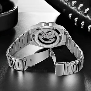 Die Phantom-Uhr überzeugt durch ihr markantes Erscheinungsbild und eine verlässliche Verarbeitung. Mit Automatikwerk und Edelstahlgehäuse vereint sie modernen Stil mit klassischer Uhrmacherkunst. Dank 30M Spritzwasserschutz und verstellbarem Armband eignet sie sich ideal für den täglichen Gebrauch.