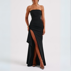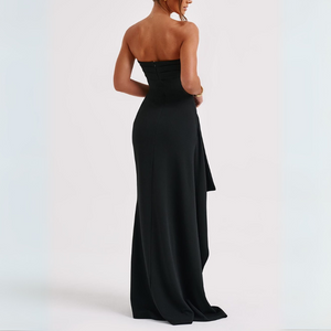 Das Sienna Abendkleid überzeugt mit einer fließenden Form und auffälligen Details. Trägerloser Ausschnitt, freigelegter Rücken und hoher Schlitz machen es zu einer ausdrucksstarken Wahl für besondere Anlässe.